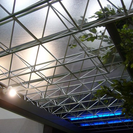 - 透光率:PC透明麻面板之透光率高達93%;即使是透明中空板,透光率仍可高達80%。有色PC麻面板則可阻隔刺眼陽光穿透,轉為曬入柔和光線。